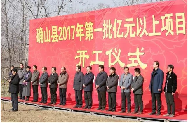 1月21日上午,确山县2017年第一批亿元以上重点项目集中开工仪式在县产业集聚区举行。市委常委、政法委书记孙巍峰,县领导路耕、彭广峰、牛清泉、聂庆忠、陶宏启、陶玉强、张建华、刘磊、吴玉冰、张杰、曹亚红、刘宏东、安永生、闫雷出席开工仪式。乡镇(街道)、局直单位负责人、企业代表等参加了开工仪式。